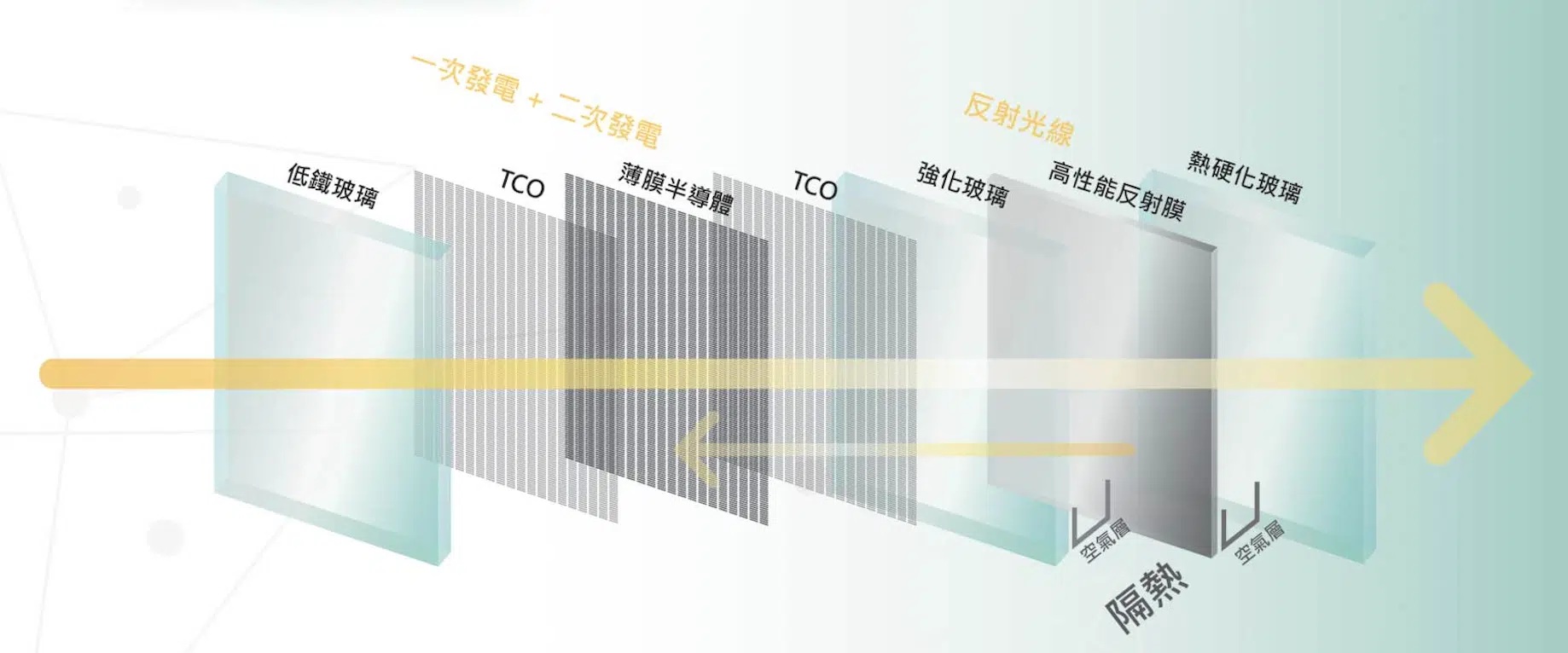 1.專利運用高效率反射膜反射可見光與紅外光,同時進行二次發電,增加發電效率16%與增加隔熱效果70%。